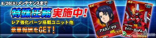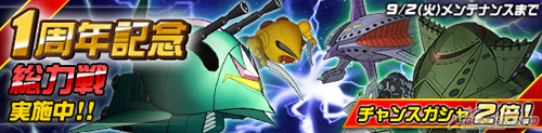 「一周年紀念總力戰」中,「渣古尼羅」、「宇宙魔蟹」、「布蘭・布羅」、「拉拉專用MA」將會登場。活動期間到9月2日(二)止,這段期間進行任務時將有機會跟上述敵方機體交戰。