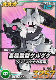 打倒敵方機體時就可以抽機會轉蛋,除了有機會獲得「★3 馬沙專用格魯古古」之外,王牌機體轉蛋中還追加了「★2 高達(普通型)」,這台機體對上敵方機體可以發揮3倍的攻擊力。