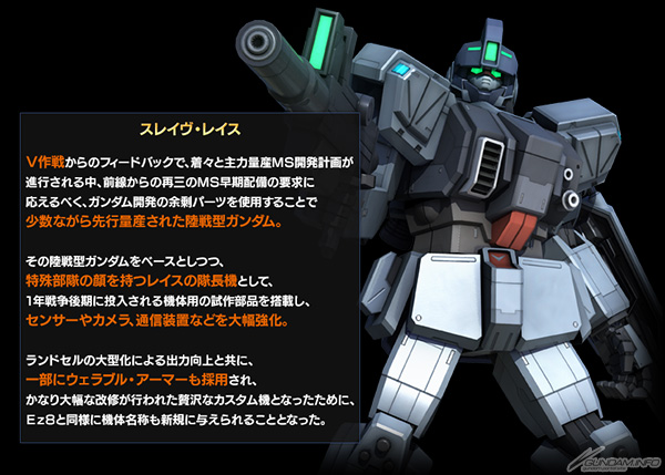 以陸戰型高達為本改造的「Slave Wraith」,是在一年戰爭後期投入的機體,搭載許多試作的裝備強化了偵查和攝影機、通訊裝置等等,是一台做了大幅改裝而獲得新機體名、堪稱奢侈的改裝機。