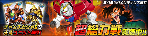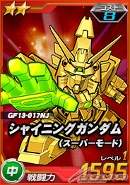 打倒「京二駕駛的魔鬼高達」就可以抽機會轉蛋S,除了有機會獲得「★4 自由高達」、「★4 高達試作一號機 全方位推進型」、「★4 百式」、「★4 馬沙專用格魯古古」、「★4 京麥古」等機體外,王牌機體轉蛋中還追加了「★2 閃光高達(超級模式)」,這台機體對上「京二駕駛的魔鬼高達」可以發揮3倍的攻擊力。