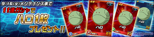從今天起到9月16日(二)止的限定期間內,將舉辦「11連王牌轉蛋限定!哈囉GET優惠活動!」。活動期間中,只要來抽11連王牌機體轉蛋,除了可以獲得11張機體卡片外,還能額外拿到1張「★1」或是「★2」的哈囉(近 or 中 or 遠)。
