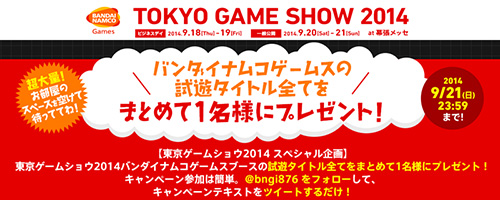 從參加活動的人當中抽出1個幸運名額,贈送「TGS2014中BANDAI NAMCO GAMES所展出的全部試玩遊戲」。