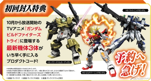 而初回封入特典將會附贈可以搶先拿到『高達創戰者TRY』中3架登場機體的商品序號,這部動畫將會自10月8日(三)起在東京電視台六大聯播網開始播映。此外也公開將同時發售PS3版(實體版)和PS Vita版(下載版)成套的超值商品——「高達破壞者2 外帶包」。