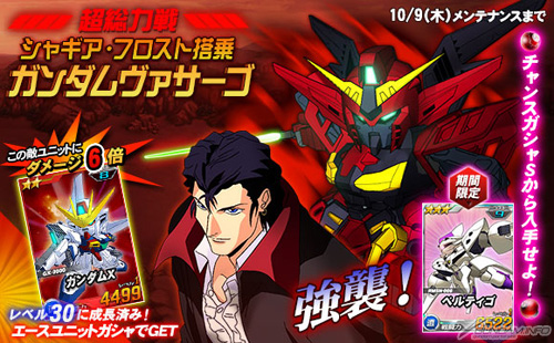 打倒「夏基爾駕駛的瓦沙可高達」就可以抽機會轉蛋S,除了有機會獲得「★3 貝爾迪哥」之外,王牌機體轉蛋中還追加了「★2 高達X」,這台機體對上「夏基爾駕駛的瓦沙可高達」可以發揮6倍的攻擊力。