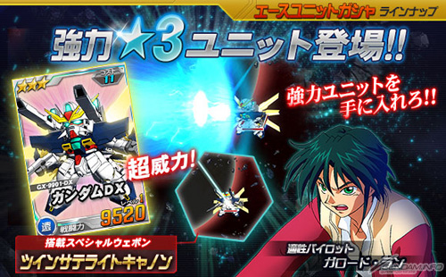 除此之外,王牌機體轉蛋也追加了「★3高達DX」;白金駕駛員轉蛋中則追加了「★3 加羅特・蘭」和「★3 卡里斯・諾迪拉斯」等角色。