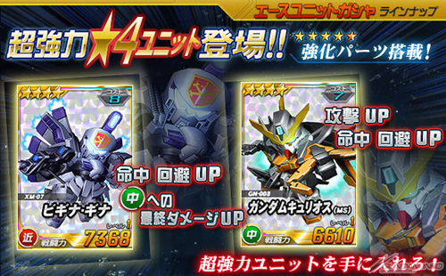 而今天起在王牌機體轉蛋中,新增了「★4 比基納‧基娜」和「★4 高達基里昂斯(MS)」等機體;這兩台機體分別裝備了「翼狀推進器」和「GN爐」,一定要來把這兩台強力機體拿到手喔!