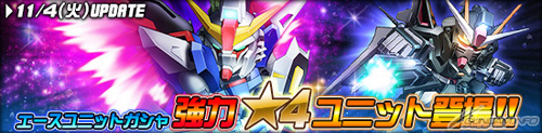 而在王牌機體轉蛋中,則新增了「「★4 命運高達」、「★4 突擊高達NOIR」、「★3瞬發型渣古幻影(雷専用機)」、「★3 捷武改(伊萊傑専用機)」、「★3 達基・伊斯(白)」、「★3 量産型鐳射大砲(白色獵犬樣式)」等機體。在這些機體中,「★4 命運高達」裝備了強化零件「Hyper Duetrion引擎」,「★4 突擊高達NOIR」則裝備了「攻擊背包系統(N)」,都是非常強力的機體,一定要把這兩台機體拿到手喔!