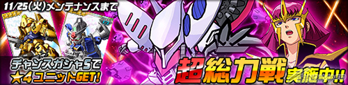 打倒「哈曼駕駛的卡碧尼」就可以抽機會轉蛋S,除了有機會獲得「★4 自由高達」、「★4 高達試作一號機 全方位推進型」、「★4 百式」、「★4 馬沙專用格魯古古」、「★4 京麥古」等機體外,王牌機體轉蛋中還追加了「「★2 ΖΖ高達」,這台機體對上「傑克斯駕駛的多魯基斯」可以發揮3倍的攻擊力。