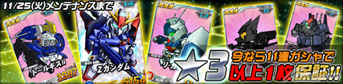 活動期間中,只要來抽11連王牌機體轉蛋,就一定會獲得1張★3以上的機體。請一定要趁這個機會,將強力的機體拿到手!