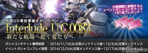 今天開始舉辦的「Interlude U.C.0083」,是為了迎接大型更新的事前準備優惠活動,活動期間中只要參加大規模戰,就能每天獲得1張可在遊戲更新後,來轉特殊轉蛋的「活動轉蛋券」。