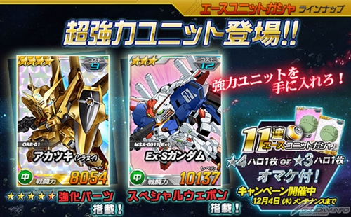 自今天起,「★4 曉(不知火)」和「★3 Ex-S高達」在王牌機體轉蛋中登場。「★4 曉(不知火)」裝備了強化零件「八咫鏡」,「★3 Ex-S高達」則裝備了特殊武裝「反射式導引砲」,這兩台都是強力機體,一定要拿到手喔!