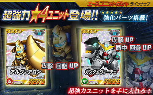 而今天起在王牌機體轉蛋中,新增了「★4 阿爾瓦亞隆」、「★4 高達華塞亞」等機體;「★4 阿爾瓦亞隆」裝備了「GN爐[T]」;而「★4 高達華塞亞」則裝備了「GN爐」,兩台都是強力機體,千萬不能錯過。