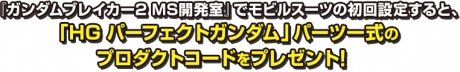 在「高達破壞者2 MS開發室」上首次設定MS,就可獲得能拿到「HG 完美高達」零件一組的產品序號。