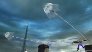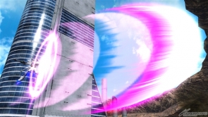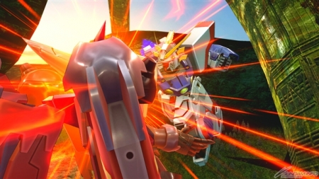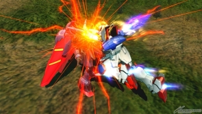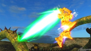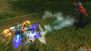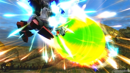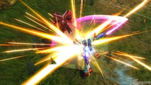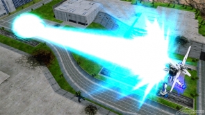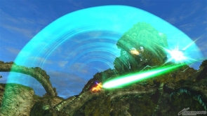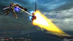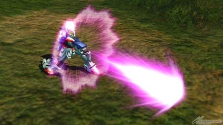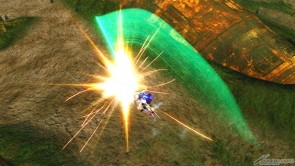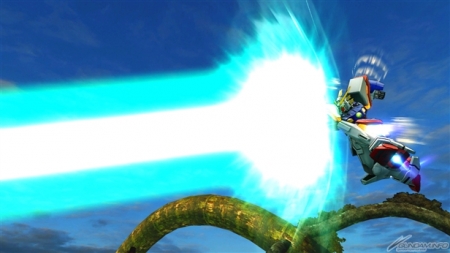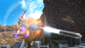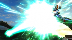 ▲特殊射擊武器「呼叫古龍高達」,根據搖桿輸入方向不同,呼叫出來的古龍高達會進行不同的攻擊。搖桿不動時,呼叫出來的古龍高達會發動超級霸王電影彈,然後由閃光高達擊出。成功擊出的時候,會增加超級霸王電影彈的速度和追蹤性能。在搖桿有動作的狀況下呼叫古龍高達,則會發動古龍連擊。