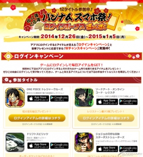 BANDAI NAMCO GAMES好評提供下載中的12款智慧型手機用遊戲,將從今天12月26日(五)起開始舉行「BANDAI NAMCO智慧型手機祭!年去年來登入獎勵拿多多」。