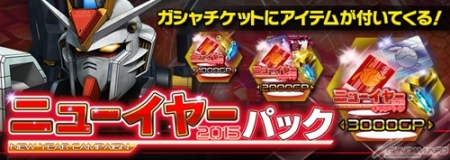 除了可一口氣獲得新年轉蛋票×7枚之外,還有額外贈送珍藏轉蛋票×1枚、2015萬資金、迷你行動EN回復包×10個、迷你指揮力回復包×10個,開始販賣超值的新年包。