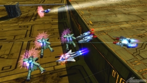 ▲集氣射擊武裝會張開兩腕部的光束盾牌,變成突擊模式。突擊模式中,除了能防禦來自自機左右方向的射擊攻擊外,自機正面還會有攻擊判定。
