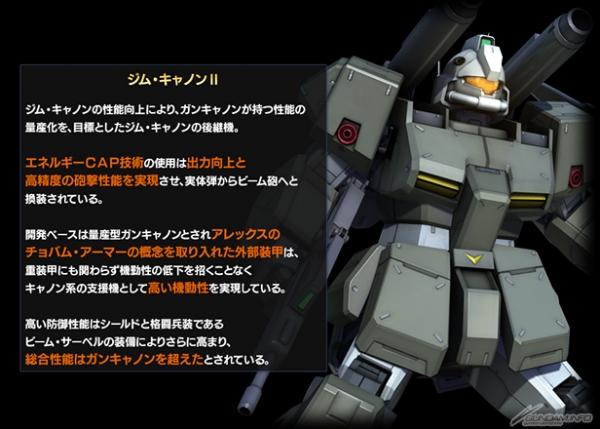 「吉姆加農II」是目標量產擁有鐳射大砲性能的吉姆加農後繼機。使用能源CAP技術,得以實現出力的提高和高精度的砲擊性能,從實體彈換裝成光束砲。開發基礎是量產型鐳射大砲,藉由取自亞雷克斯複合裝甲概念的外部裝甲,實現了加農系作為支援機的高機動性。綜合性能被認為超越了鐳射大砲。