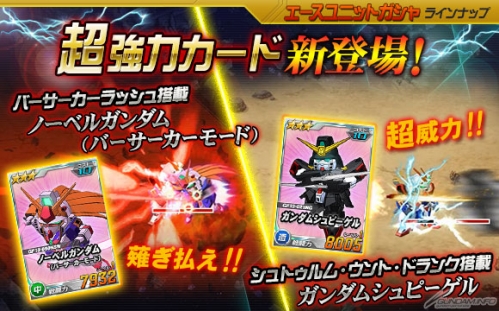 今天起在王牌機體轉蛋中,「★3 美少女高達(狂戰士模式)」、「★3 鏡高達」等等機體登場。特別武裝部分,「★3 美少女高達(狂戰士模式)」是搭載「狂戰士衝刺」的強力機體,而「★3 鏡高達」是搭載「狂飆醉」的強力機體,請一定要獲得。