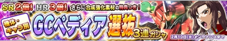 除了有SR2倍・HR3倍的出現率以外,「GC PEDIA機體選拔3連轉蛋」並還隨附哈囉×2枚、「GC PEDIA角色選拔3連轉蛋」有強化膠囊×2枚的特典。