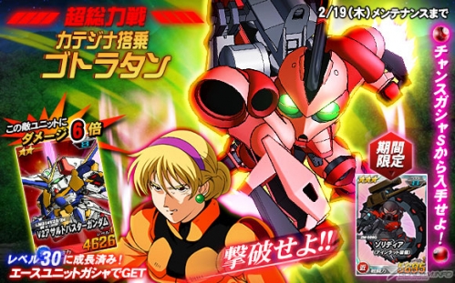 超總力戰到2月19日(四)為止的限定期間內將會有「卡堤珍娜駕駛的高特拉坦」登場,活動期間中進行任務的同時,有機會遭遇「卡提珍娜駕駛的高特拉坦」。