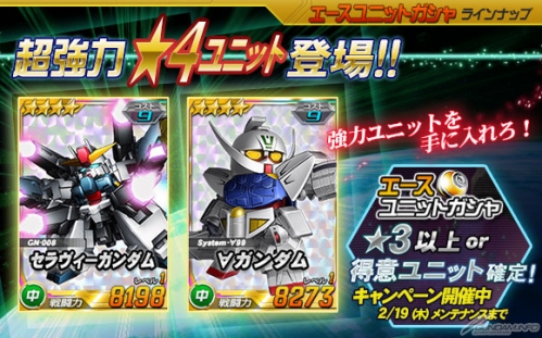 且除了在王牌機體轉蛋中追加「★4 舒拉華高達」、「★4 ∀高達」以外,並同時開始「★3以上 or 得意機體確定活動」和「情人節活動」等3個活動,將一起來介紹。