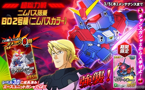 總力戰到3月5日(四)為止的限定期間內,「尼姆巴茲搭乘BD2號機(尼姆巴茲配色/EXAM)」將會登場,在活動期間中進行任務的時候,有機會遭遇「尼姆巴茲搭乘BD2號機(尼姆巴茲配色/EXAM)」。