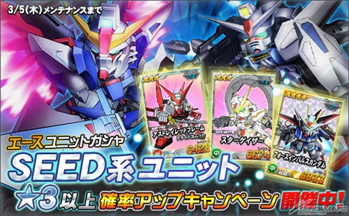 活動期間中,「王牌機體轉蛋」以及「11連王牌機體轉蛋」中出現「機動戰士高達SEED系機體」中「★3」以上機體的排出確率將會上升。