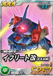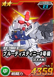 打倒「「尼姆巴茲搭乘BD2號機(尼姆巴茲配色/EXAM)」的時候可以抽機會轉蛋S,除了有機會獲得「★3伊弗利特改(EXAM)」等等以外,也在王牌機體轉蛋中追加可以對「尼姆巴茲搭乘BD2號機(尼姆巴茲配色/EXAM)」發揮6倍攻擊力的「★2 藍色命運3號機(EXAM)」。
