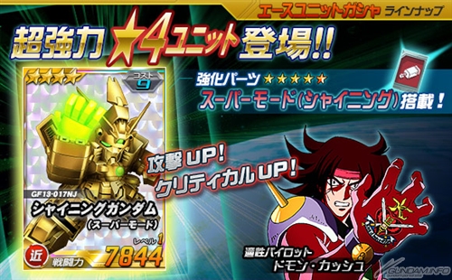 從今天起,王牌駕駛員轉蛋追加了,搭載了強化零件「超級模式(閃光高達)」的「★4 閃光高達(超級模式)」之外,「★3 飛翼高達零式」、「★3 沙煞比」、「★3 V2高達」等機體也再次登場了。