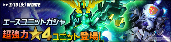 王牌機體轉蛋中,「★4 報喪女妖(覺醒)」、「★4 比基納‧基娜」、「★3 高達艾斯亞索補版II」登場。強化零件部分,「★4 報喪女妖(覺醒)」搭載「精神感應框架」、「★4 比基納‧基娜」搭載「翼狀推進器」,都是超級強力的機體,請一定要獲得。