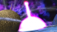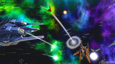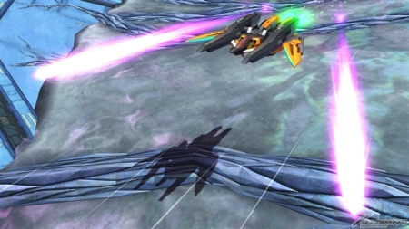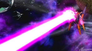 ▲搖桿往後的副射擊武裝,會使用GN劍步槍與GN加農砲一起發射照射光束的「一斉射擊」。