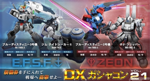 今天起開始發布「DX轉蛋VOL.21」。這次的重點機體是「蒼藍宿命3號機」、「吉姆引導騎士II」、「蒼藍宿命2號機」、「渣古海鰭」等4台新機體。全新登場的「EXAM系統」與能夠幫助即時修理的「雙管修復火炬」等等武裝,將會在戰場引起新的旋風。