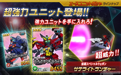 從今天起在王牌機體轉蛋中,搭載了特別武器「衛星破壞砲」的「★3華沙哥高達CB」和「★3 阿斯特龍HC(MS)」登場。