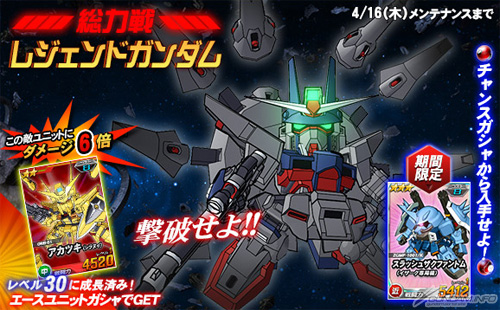 總力戰到4月16日(四)為止的限定期間中,有「傳說高達」登場,活動期間中,進行任務的時候,有機會遭遇「傳說高達」。