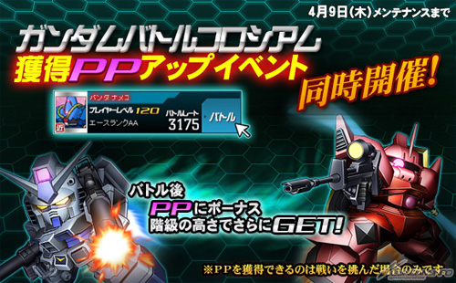 今天4月2日(二)起同時開始「高達戰鬥競技場」和「獲得PP增量活動」。