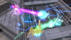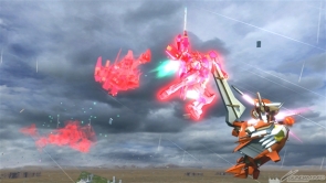 ▲大型推進器分離後的特殊格鬥會發動精神感應框架共鳴,麻痺自機周圍的機體。並同時會使用感應砲盾牌發動攻擊,是攻防一體的招式。