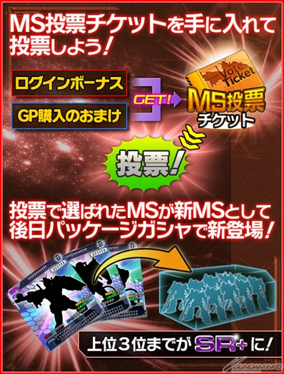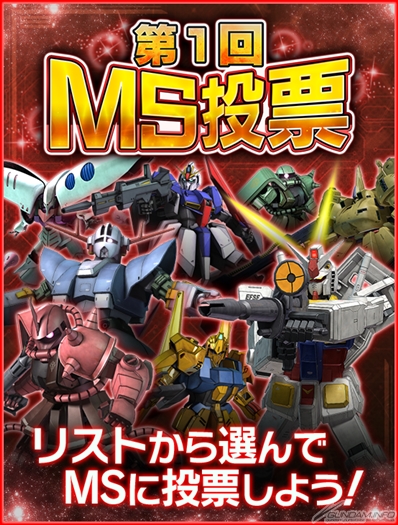 以『機動戰士高達』和『機動戰士Ζ高達』中登場MS為對象的「第1屆MS投票」,只要使用每日登入獎勵中獲得的MS投票券,即可投票給喜歡的MS。在投票中獲選為前三名的機體,將於之後成為「新SR+MS」在包裝轉蛋登場。