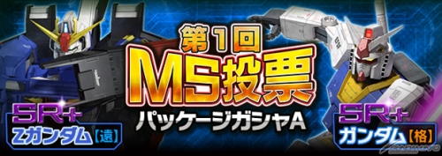 以『機動戰士高達』和『機動戰士Ζ高達』中登場的MS為對象實施了「第1回MS投票」。現正舉辦投票中獲得前3名的機體以SR+登場的「第1回MS投票封包轉蛋」中。