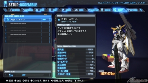▲畫面右邊表示的是機體構成。使用高達模型製作技巧(配色和風化),不管是什麼機體也可以變得很帥氣!?