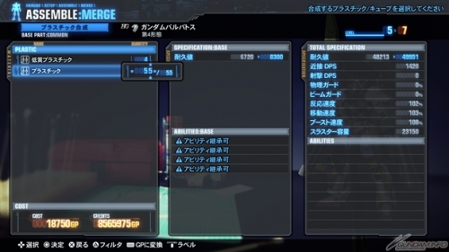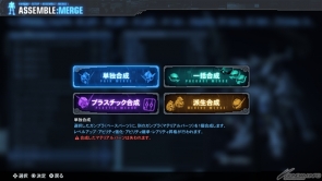把想要強化的零件和在任務中獲得的經驗値上昇道具(塑膠)以及強化・繼承能力道具(立方體)合成。想要強化的零件會升級、能力強化、能力繼承。合成過後的塑膠和立方體會消失。