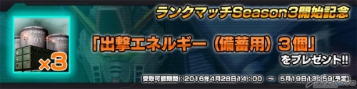 紀念排名戰Season3開始,贈送「出擊能源(儲備用)3個」,排名戰Season3期間中遊玩遊戲就可以獲得。舉辦期間到5月19日(四)13:59為止。