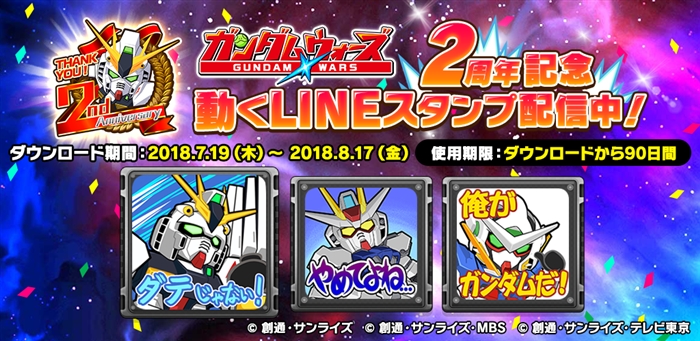 為了紀念2週年,「LINE: 高達大亂鬥」推出原創LINE貼圖免費下載。包含了8種在高達系列中出現,充滿特色的著名台詞動畫貼圖。獲得方法請至遊戲內的告知內確認。