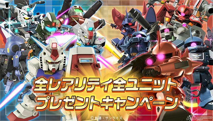 為紀念大型更新,舉辦了高達遊戲APP史上首次的「全稀有度全機體贈送活動」。是可一口氣獲得相當難以入手,以及在敵方陣營無法收集到的機體的難得機會。請把握這個機會來強化自己的隊伍吧。