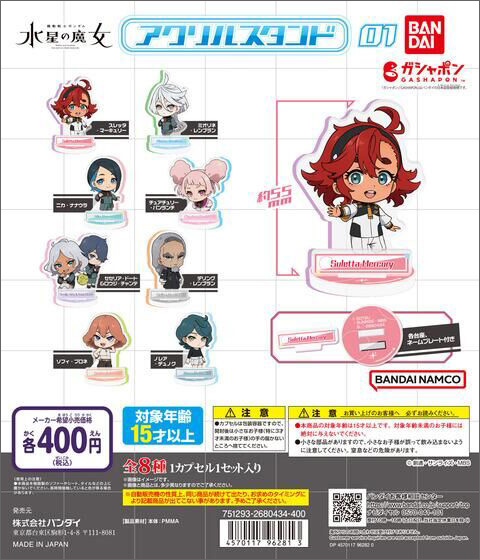 轉蛋商品「機動戰士高達 水星的魔女 壓克力立牌01」,將於2月第5週起在日本國內轉蛋自動販賣機等處依序發售。售價為1次400日圓(含稅)。