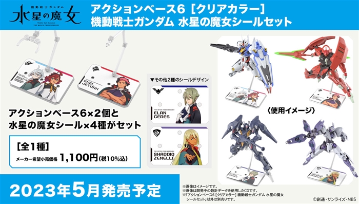 出自『機動戰士高達 水星的魔女』,高達模型(高達的塑膠模型)用「動作底座6[透明彩色]」搭配『水星的魔女』特別貼紙的組合包將於5月發售。價格為1,100日圓(含稅)。