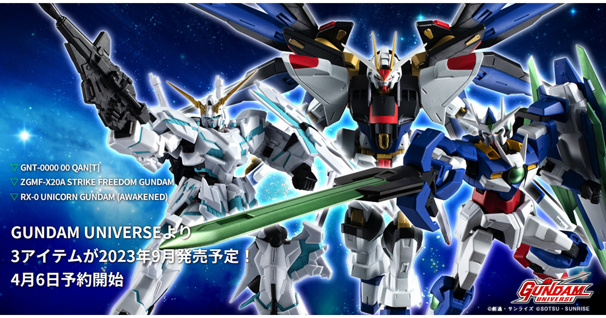 魂NATIONS推出的「GUNDAM UNIVERSE」最新彈,突擊自由高達、量子型00、獨角獸高達(覺醒時款式)決定於9月發售。