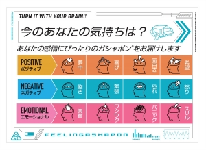 「心情GASHAPON」是前所未有的“用頭腦來轉蛋的GASHAPON”。從喜悅、緊張、興奮等人間所擁有的12種心情中,現在正感受到什麼心情呢?戴上頭套(測定器)即時掃描分析體驗者的腦電波,提供適合這種心情的GASHAPON商品。