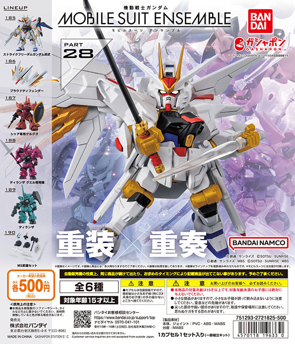 以武裝造成的輪廓變化為主題的「MOBILE SUIT ENSEMBLE」系列第28彈,商品陣容共5種,包含出自『機動戰士高達SEED FREEDOM』的「突擊自由高達二型」和「榮耀護衛機」、出自『機動戰士高達』的「馬沙專用格魯古古」、出自『機動戰士高達 水星的魔女』的「迪蘭扎 古爾專用機」「迪蘭扎」等,還有「MS武器套組」。