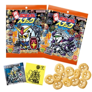 商品是“勾起鄉愁的鹽味”零食餅乾,附贈52mm×52mm的方形貼紙。貼紙上的圖案是1988年發售的SD高達組裝式玩具系列「元祖SD高達」的包裝插圖。